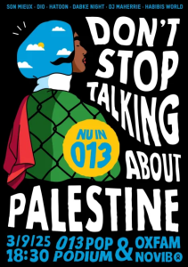 Op woensdag 3 september organiseert Oxfam Novib en 013 een nieuwe editie van Don’t Stop Talking About Palestine  een avond vol muziek, inspirerende talks, kunst, cultuur én lekker eten.